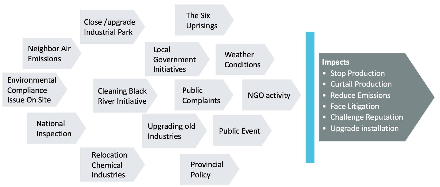 In response to the systematic country-wide pressure for improvement in environmental indicators, local government officials across the country are more frequently using highly disruptive enforcement tools, including mandatory production curtailment, (temporary) company closures, and forced relocations. Such environmental enforcement initiatives from local governments are guided by local environmental quality objectives as well as local industrial policies, each with their own timeline and priority. Priorities and timelines are different in different regions and for different industries.
