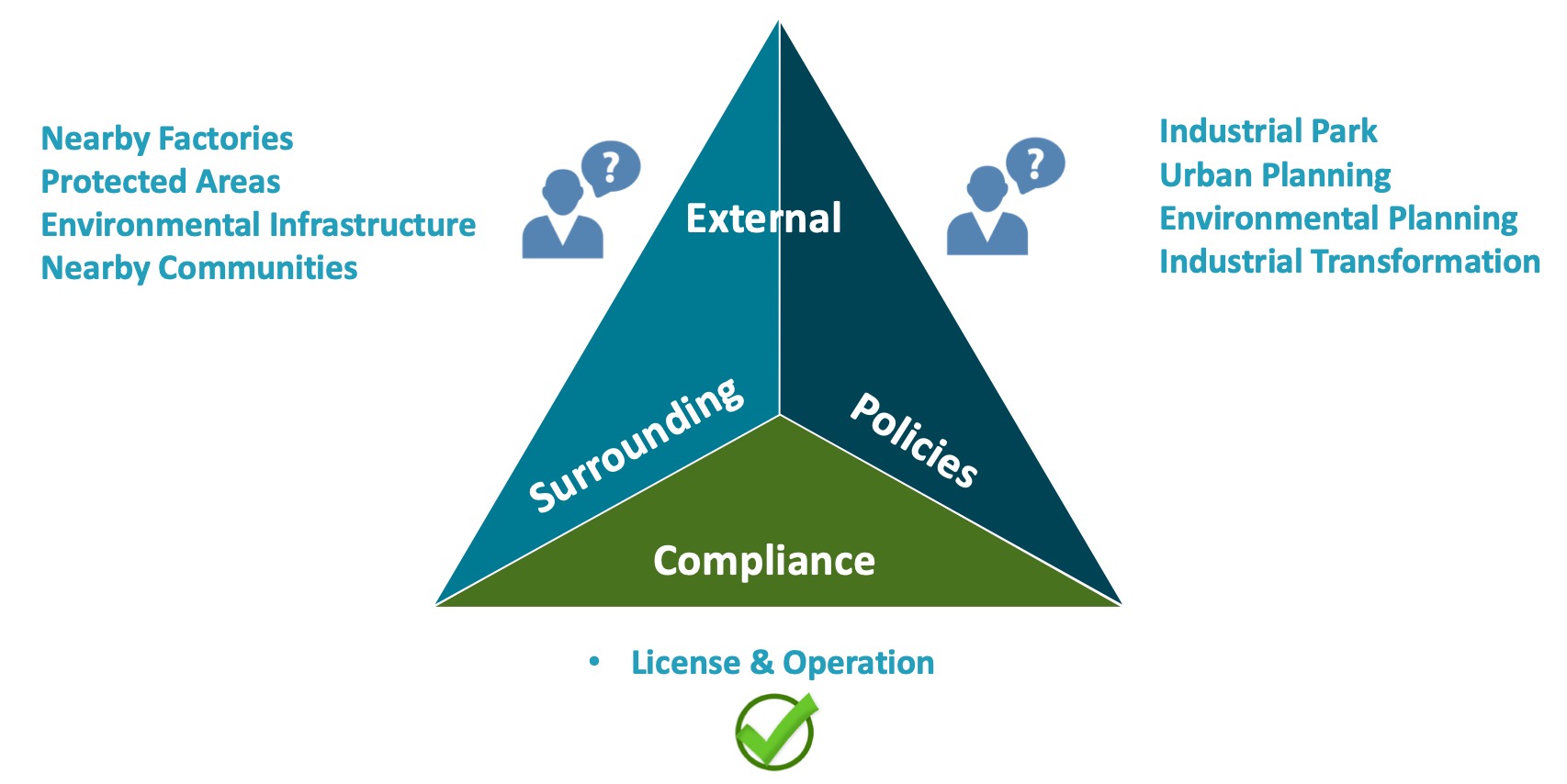 Three-dimensional risk screening includes the Compliance dimension, where key risks comprise environmental permitting and compliance management for air, waste and wastewater on one hand, as well as the Surrounding and Policies dimensions on the other hand, where key risks include: