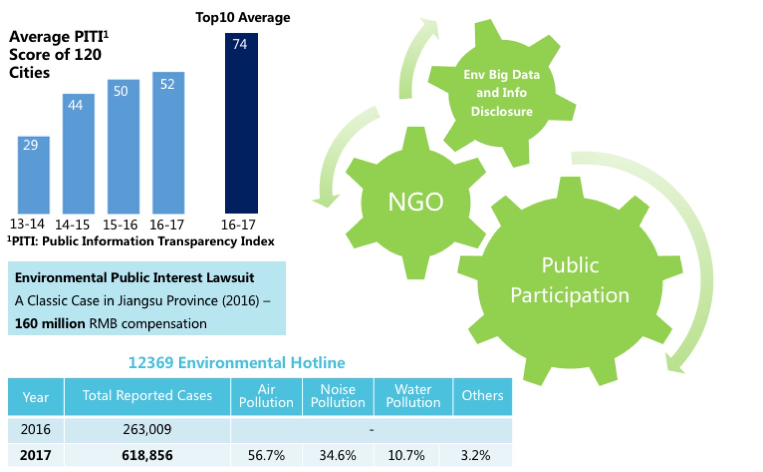 China has rapidly adopted environmental data transparency and civilian governance as key instruments to speed up the country’s transition to an Ecological Civilization. Environmental hotlines are provided to the public in all major cities and these cities are ranked by a nationwide Pollution Information Transparency Index (PITI) based on their disclosure of company violation records, supervision reports, monitoring data, etc. Although published by a Beijing-based IPE, a Non-Governmental Organization, the PITI enjoys near-universal official recognition in China and is widely referenced in official circles. The central government has also started publicly rating companies on their environmental performance.