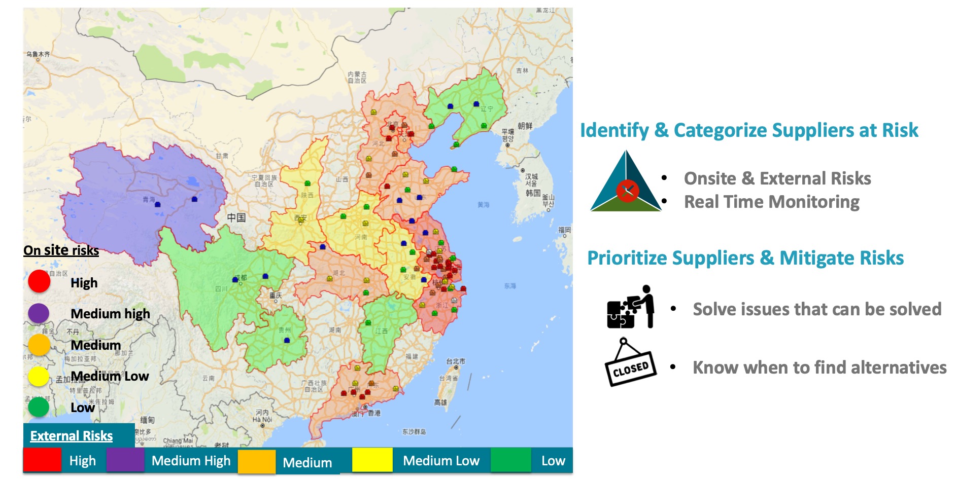 A factory’s risk exposure depends on a combination of the above factors. Today’s data transparency also allows for enterprises to engage in data-enabled risk screenings that assess China manufacturing locations’ overall exposure to a combination of external factors.