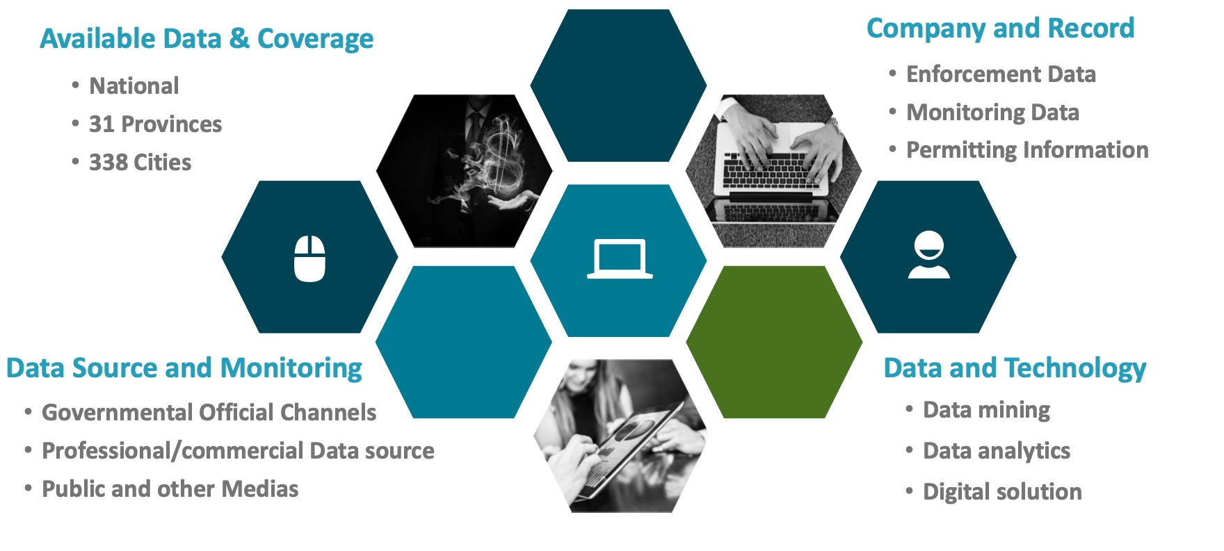 GREENMENT has the largest independent environmental information database in China with 10 years of history, over 1.4 billion environmental data points, nation-wide coverage, including central government, 31 provinces, and 338 cities. GREENMENT’s database covers over 3 million companies with real-time and historical on-line monitoring data, including over 1 million records of environmental complaints, governmental notices, and violation/penalty records that indicate environmental performance of any listed company. Over 3,000 information platforms (official, public and social media) are covered to provide targeted and precise identification of environmental information related to supervision / enforcement actions/plans and latest government movement in environmental campaigns.